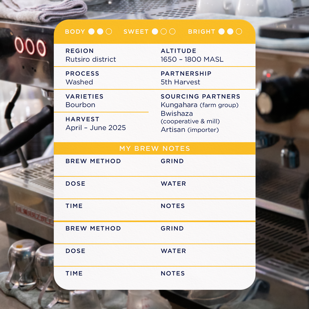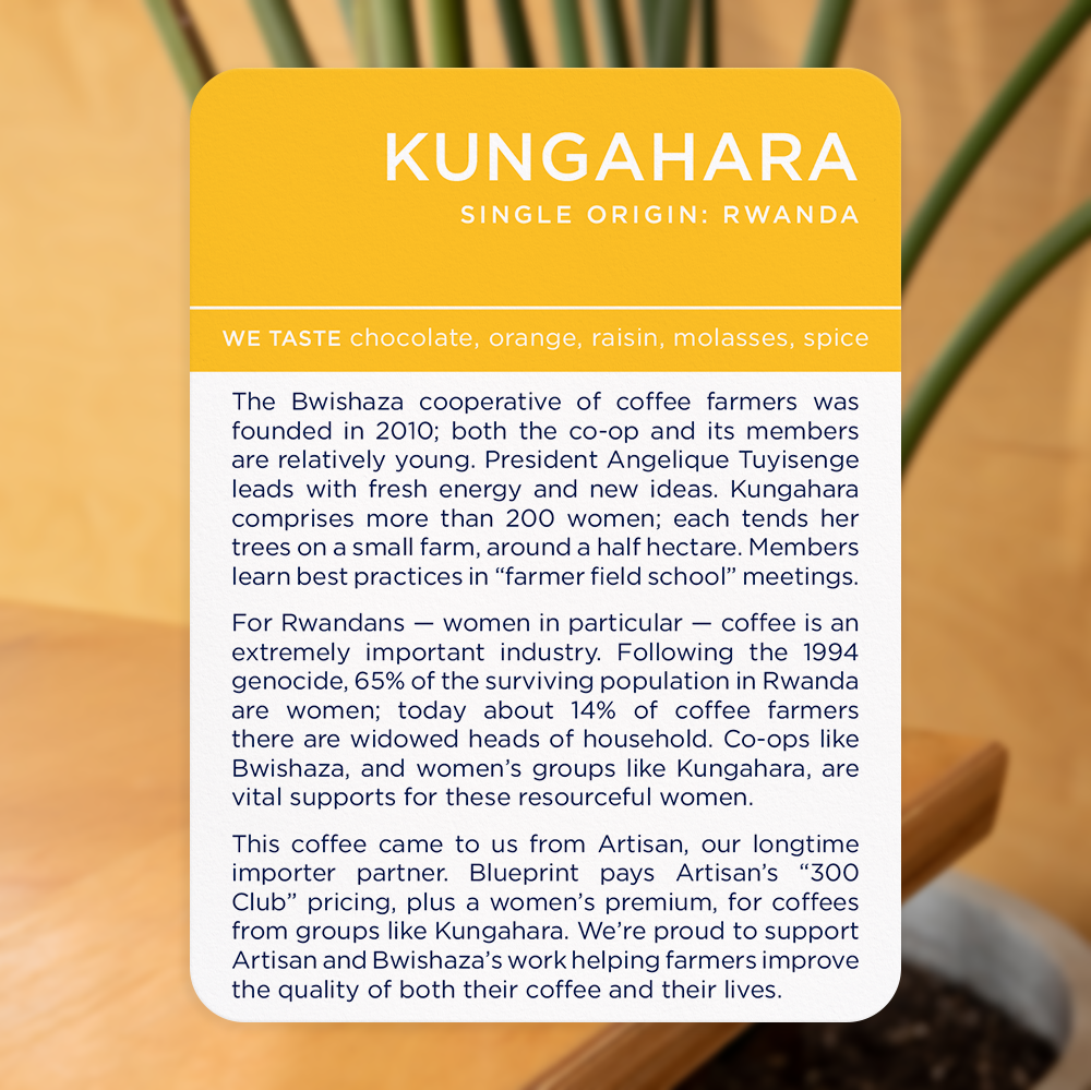 This coffee came to us from Artisan, our longtime importer partner. Blueprint pays Artisan’s “300 Club” pricing, plus a women’s premium, for coffees from groups like Kungahara. We’re proud to support Artisan and Bwishaza’s work helping farmers improve the quality of both their coffee and their lives.