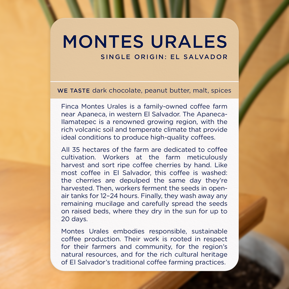 Montes Urales embodies responsible, sustainable coffee production. Their work is rooted in respect for their farmers and community, for the region’s natural resources, and for the rich cultural heritage of El Salvador’s traditional coffee farming practices.