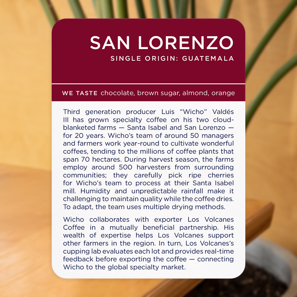 In turn, Wicho serves as Los Volcanes’s base of operations in Cobán. His detailed work and hands-on experience provide a wealth of knowledge to Los Volcanes, helping them support other producers in the region. This kind of collaboration in a network of supportive, sustainable relationships is what makes specialty coffee is so special. From Wicho’s team at San Lorenzo, all the way to our own roastery — and then to your cup — the hard work and skill of hundreds of people are behind each sip of this lovely offering.